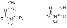 Main directions of fragmentation of molecular ions of perfluorosubstituted 1,3-diazines and 1,2,4-triazoles.L.M.Popova, S.V.Vershilov Investigation of mass-spectra of heteroaromatic compounds has shown that pyrimidines, 1,2,4-triazoles and most of their haloido-, alkyl- and amino- derivatives as conjugated systems possess quite a high (Wm over 10%) stability with regard to electron impact [1-3] , which allows to accurately determine the molecular mass of the compounds. Thus, the relative intensity of molecular ion M+ of unsubstituted pyrimidine is 42% and at its dissociation two molecules of hydrogen cyanide are split off consequently resulting in formation of fission ions [C3H3N]+ and [C2H2]+ with the intensity of 15 and 16% respectively. [4]. The mass spectrum of 1H-1,2,4-triazole is similar to that of 1,2,3-triazole. On the basis of data on mass-spectra of deutero analogues of 1,2,4-triazole and some its derivatives it has been concluded[4] that in gas phase M+ of these compounds exists in two asymmetric tautomeric forms. Decomposition of derivatives of 1,2,4-triazole runs mainly by elimination of HCN or RCN according to different mechanisms [4], elimination of the molecule N2[2] is slight ( peak intensity is less then 1%) in the presence of perfluorosubstitutes in the azole molecule. The technique of chromato-mass-spectroscopy ( electron impact, 70eV) was used for confirmation of the structure and composition of 6-perfluorosubstituted 2-amino- (1), 2-hydroxy- (2), 2-mercapto- (3) and 2-methylthio- (4) 4-methylpyrimidines and 3-perfluorosubstituted 5-amino (5-7) and 5-mercapto- (8) 1,2,4-triazoles.