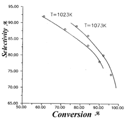Pyrolysis has been conducted in temperature range of 973 – 1123 K at various contact intervals. Compound (II) was diluted by aqueous vapor for the decrease of contribution on the part of side reactions.