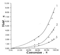 ![]() Fig.1. The dependence of trifluorochloroetylene selectivity from 1,1,2-trifluoro-1,2-dichloroethane conversion. | ![]() Fig.2.The dependence yields of 1,1,2-trifluoro-1,2-dichloroethane pyrolysis products from conversion. 1-CO, 2-C4F6Cl2, 3- CF2ClH, T=1073 K |