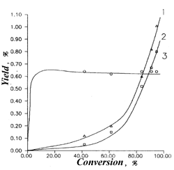 ![]() Fig.3.The dependence of 1,1,2-trifluoro-1,2-dichloroethane conversion from retention time. Dilution by water vapor 1:3 | ![]() Fig.4.The dependence yields of 1,1,2-trifluoro-1,2-dichloroethane pyrolysis products from conversion.1- C3F4Cl2, 2-C3F5Cl, 3- C2F2Cl2, T=1073 K |
