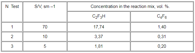 During the analysis of 1,1,2-trifluoro-1,2-dichloroethane thermal decomposition an apparent influence of the reactor’s walls on the speed of trifluoroethylene and hexafluoro-1,3-butadiene formation has been discovered. To verify the assumption of heterogeneous character of the aforementioned reactions, tests with various surface-volume ratio (S/V, cm-1) have been carried out (Table 1).
