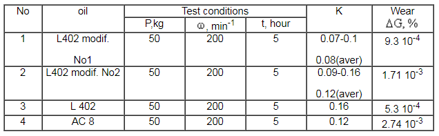Antifriction properties of oils produced as a result of hexafluoropropene addition to laprols, data of measurements conducted at the RSC “Applied Chemistry” are given in the Table