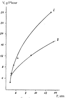 Fig.2. Dependence of the copolomerization rate of TFE and -bromo -perfluoroalkylvinyl ethers in a water-emulsion medium (V,g/L*h) on the TFE pressure (P,kg/cm2)