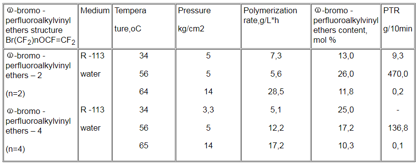 As it is seen in Fig.1 and 2, the copolymerization rate and the -bromo -perfluoroalkylvinyl ethers content in the copolymer are strongly dependent on the TFE concentration ( pressure in the reactor) and increasing the length of perfluoroalkylen fragment in the