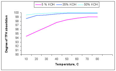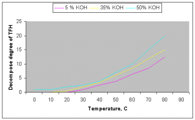 It was determined, that the degree of tetrafluorohydrazine decay essentially increases when temperature and alkali concentration increases. For the purposes of illustration picture 1 represents the results of