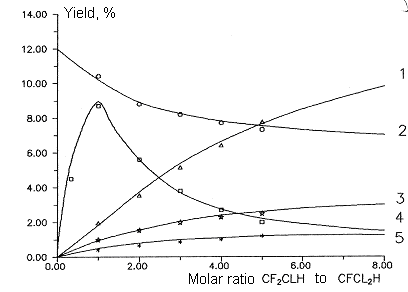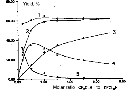 5. Dependence of by- products yields of chlorodifluoromethane and