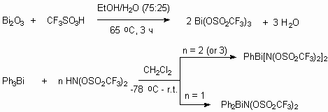 The main obtaining methods of perfluoralkanesulfo-acids and bis(perfluoroalkanesulfonyl)imides are their interaction with corresponding oxides of elements. Thus, the reaction with bismuth oxide in the media, containing the mixture of water and ethyl alcohol [110,111] or bismuth compound [112] produces corresponding bismuth derivatives. It's better to use C1 - C3 the alcohol mixable with water, the optimal ratio water/alcohol from 1:1 up to 9:1, and molar ratio of CF3SO3H/Bi2O3 is 6:1 - 6.5:1 (yield 97 %). Such salts are used as catalysts for carrying out chemical reactions of different types.