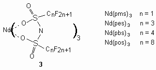 They are new ligands for lanthanide complexes creating, especially neodymium 3 [113], ytterbium and yttrium [114,115], lanthanum [116-118], europium [90] and other metals (B, Al, Ga, In, Tl, Si, Ge, Sn, Pb, As, Sb, Bi, Te) [119,120]. These complexes are excellent catalysts of Friedel-Crafts and in the last years there was found an application for them.. Eu[N(SO2C8F17)2]3 produces luminescence with quantum yield 56.8 % [90].