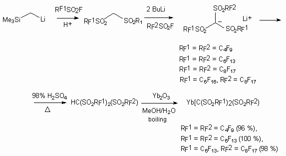 The ytterbium salts of tris(perfluoroalkanesulfonyl)methidine were obtained according to the following scheme [121: