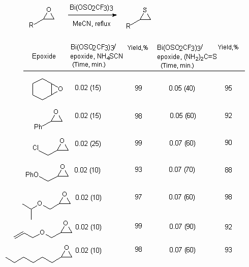 Bi(OSO2CF3)3 catalyses epoxides turning into thiirans in the presence of ammonium thiocyanate and thiourea [123c,d].