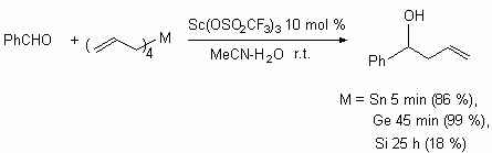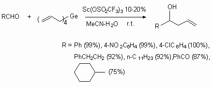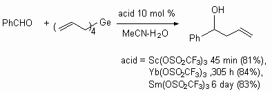 Trifluoromethanesulfonates of scandium, ytterbium and samarium appeared to be rather effective catalysts of reaction of tetrakis(allyl)germanium with carbonyl compounds, for example with benzaldehyde [125].