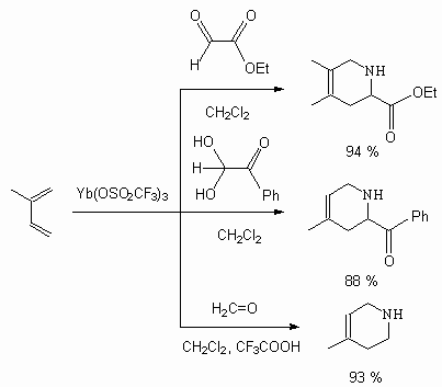 Diels-Alder reaction of different dicarbonyl compounds and 1, 2 - diens passes with high yield in mild conditions when using ytterbium trifluorometansulfonate as catalyst [131].