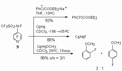 The fluoridation of organic compounds using N-fluorosulfonamides is described by many examples [136,140]. Thus, sulfonamides of 9 type fluorinate salts of malonic acid derivatives and aromatic compounds [135,140-146].
