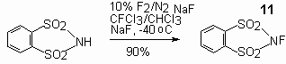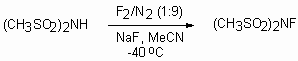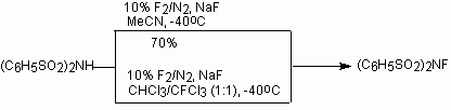 N-fluorodiphenylsulfonimide is a white crystal substance, dissoluble in plenty of organic solvents (ether, THF, CH2Cl2, MeCN, C6H5CH3), convenient in handling, non hydroscopic and stable for storage. N-fluorodimethylsulfonimide, another N-fluorodialkylsulfonimides [(CH3(CH2)nSO2)2NF, n = 1-3] and N-fluoro-[1,3,2]-dithiazine-1,1,3,3-tetraoxide was produced similarly[151]. Water or water mixture with organic solvent can be used as media. Best results are achieved with sodium salts of corresponding sulfonamides [152]. Thus, N-fluorodimethylsulfonimide is obtained at action of elemental fluorine (F2/N2 = 1:9) in acetonitrile in presence of sodium fluoride at -40oC with the yield 90% [153].