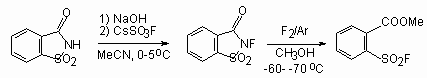 At fluorination of sodium saccharin salt by caesium fluoro-oxy-sulfate in acetonitrile at 0-5oC N-fluorosaccharin is obtained with the yield of 69%, while fluorine influence on this compound in methyl alcohol at -60 - -70oC results in uncovering of heterocycle and formation of o-fluorosulfonylmethylbenzoate (yield 28%) [154].