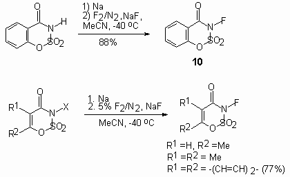 Fluorine-containing analogue of saccharine 10 is obtained by influence of diluted fluorine on sodium salt of benz-1,2,3-oxathiazine-4(3H)-one-2.2-dioxide in acetonitrile at low temperature in presence of sodium fluoride [155,156]. This reagent 10 is a crystal substance of sufficient stability and has a high capability for fluorination. Mainly it is used for fluorination of different salts, steroids and aromatic compounds.