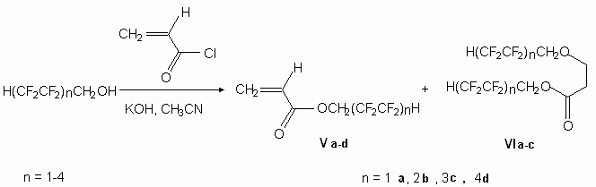 When linear fluorinated alcohols H(CF2CF2)nCH2OH (IV n = 1-4 : a-d ) are acting upon acrylic acid chloroanhydride in the presence of bases (KOH, NEt3) acrylates (Va-d) are formed in acetonitrile. Here the base has a defining role. Thus when we use potash (K2CO3) a corresponding ester of acrylic acid (Va) is formed in acetonitrile together with starting alcohol; NEt3 forwards the forming of just one product (Va), while KOH is very effective, however we get not only the product we've expected (Va), but also the compound (VIa), which is a result of fluorinated alcohol addition according to bond reaction product C=C (Va). Earlier it was showed [21] the formation of addition product according to C=C bond of telomeric alcohols with acrylonitrile, though that authors conducted the reaction in the presence of metallic sodium at 40 oC (yield = 73 %). We have showed, that other telomeric alcohols at present conditions with acrylic acid chloroanhydride produce along with actylates (V b-d) also compounds (VIb,c) (diagram 3).