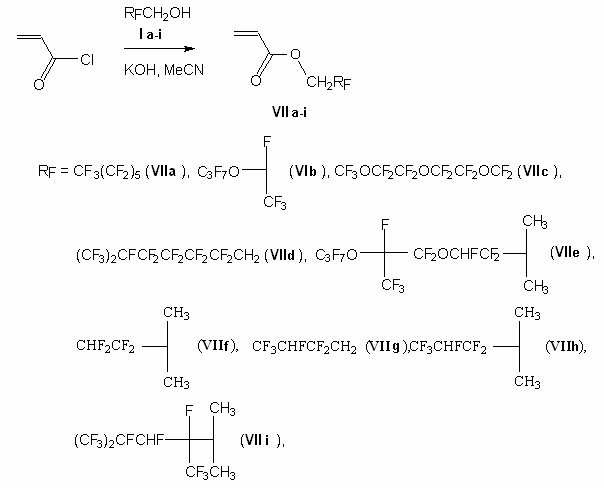 Thus, depending on fluorinated alcohol used we should use either triethylamine or KOH as a base, it depends on their activity. Other fluorinated alcohols having a branching in carbon chain especially in its beginning or oxygen atoms were introduced into reaction, at we got acrylates (VIIa-i) (diagram 4).