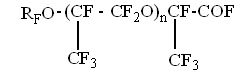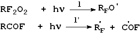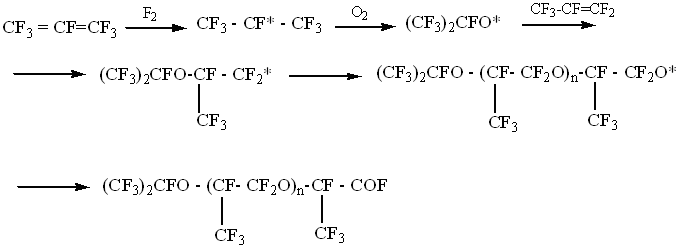 here: RF=CF3,(CF3)2CF- It is typical for chemical fluorine-initiated processes that their products in fact do not involve neither fluoroformiate nor difluoromethylene oxide groups those being, however, mandatory in photochemical oxidation products. It is anticipated that chemical fluorine-initiated hexafluoropropylene/oxygen co-polymerization occurs according to as follows: