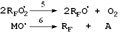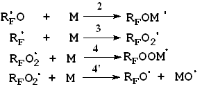 Here: M = C3F6, RF = CF3, M, A = CF2O, CF3COF Oxidation reactions start under the action of UV emission with wavelength less than 320 nm; low-pressure or medium-pressure mercury lamps are applicable for this purpose (e.g., DRT-400). Hexafluoropropylene, other fluoroolefines and their mixtures with oxygen, when free of impurities and oxidation products, do not absorb UV with wavelength more than 200 nm. That is why the reaction has got a short induction period during which fluoroolefines that are present in negligible amounts convert to some UV-absorbing substances, such as CF3COF or peroxides, and their further photolysis results in peroxide O-O bonds rupture (reaction 1) and/or in acylfluoride C-C bonds rupture (reaction 1') followed by the formation of free radicals that initiate chain reactions between olefins and oxygen (reactions 2 - 4). One cannot also rule out another mechanism of the reaction active centre origination through the formation of donor-acceptor oxygen-hexafluoropropylene complexes with absorption spectra shifted to longer wavelengths. Photolysis of such complexes may result in active species able to initiate oxidation reactions. It is well known that even at low temperature perfluoroalkoxy radicals tend to undergo degradation by C-C bonds, and consequently the radical decomposition (reactions 5, 6) contributes much to the chain development reactions. According to the available test results and published data reactions of peroxyradicals is the most important among all chain interruption processes [6]. Some fluorine-containing peroxyradicals thus formed may undergo recombination (reaction 5) resulting in two perfluoroalkoxyradicals that readily continue the chain. Basing on our mass-spectroscopy results and in conformity with available published data [7] we made the conclusions about the structure of hexafluoropropylene oxidation products: it contains a linear skeleton that consists of perfluoroalkyls C3F6, connected through oxygen atoms or through oxygen-bridge bonds: