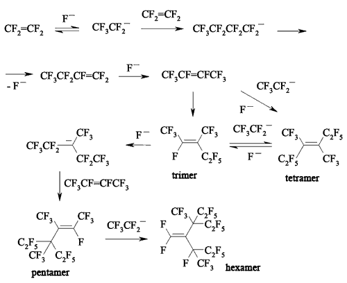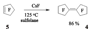 JSV Halogen (continuation) 6. Oligomerization of Perfluorolefines with Fluoride-Ion Participating As fluoride-ion is eliminated during the reaction of perfluorolefins and nucleophilic reagents, this provokes the process of oligomerization of both initial perfluorolefine and olefine isomerizated by fluoride-ion. Thus, fluoride-ion catalyzes the oligomerization of tetrafluorolefine, resulting in forming of olygomers [110-112]. The oligomerization of perfluorolefines and perfluorocycloolefines under the influence of fluoride-ion is well known [113,114]. Thus, the oligomerization of tetrafluoroethylene produces the mixture ranging from trimer to hexamer due to the generation processes of quite active carbanions and due to the isomerization processes of intermediate perfluorolefines. The oligomerization of hexafluoropropylene under the influence of fluoride-ion and over the crown ether goes by the analogous pattern. Thus, perfluoro(4-methyl-3-isopropylpent-2-ene) and perfluoro(3-ethyl-2,4-dimethylpent-2-ene) were obtained out of hexafluoropropylene under that conditions. In case of hexafluorobuta-1,3-diene fluoride-ion catalyzes the polymerization process [115]. Besides the polymer, the compound named hexafluoro-but-2-ine was isolated as well. That allowed the authors to suggest the following scheme of transformations: The oligomerization of perfluorocycloalkenes goes according the analogous scheme. Here the mixtures of dimers are formed as a rule and the reactions are quite sensitive to the conditions of carrying out the process. Thus, perfluorobicyclophenylidene 4 is formed out of perfluorocyclopentene 5 by CsF acting in sulfolane at 125 oC [116] or during the heating at that temperature for 20 hours (yield is 86 %) [117].