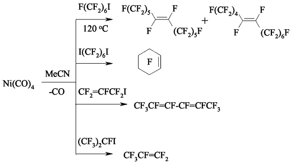 Later [134] it was proved, that carrying out of these reactions in donor solvents can result in appearance of metal-organic compounds with perfluoroalkyling properties. For example, at interaction of perfluoroalkyliodides and nickel tetracarbonyl at 25-60 oC in acetonitryl either dimer products or unsaturated compounds are formed [135].