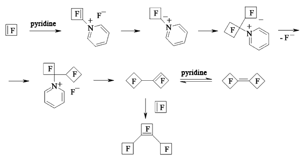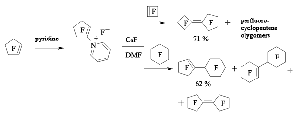 At first, when pyridine is influencing perfluorocyclobutene the salt which contains active cyclobutenylic anion is formed [119,121]. When the perfluorocyclobutene is in excess or in case of adding another perfluorolefine to the reaction mixture the reaction replacing fluorine atom at multiple bond takes place.