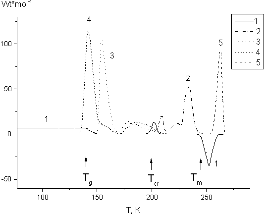 The polymerization process kinetics was investigated with the help of differential scanning calorimeter [13]. The same method was applied in our study of the monomers phase state. The rate of samples cooling from room temperature to 77 K was 2 K/s.