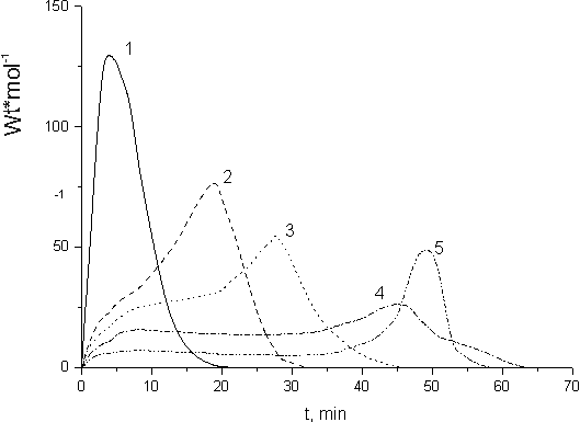 Fig. 10. Dependence of the heat release velocity (polymerization) on the time of irradiation (dose) for: 1 -FA-2; 2 - FA-2 (92.5 mole. %) + FMA-2(7.5 mole. %); 3 - FA-2 (83 mole. %) + FMA-2 (17 mole. %); 4- FA-2 (40 mole. %)+ FMA-2 (60 mole. %); 5 - FMA-2