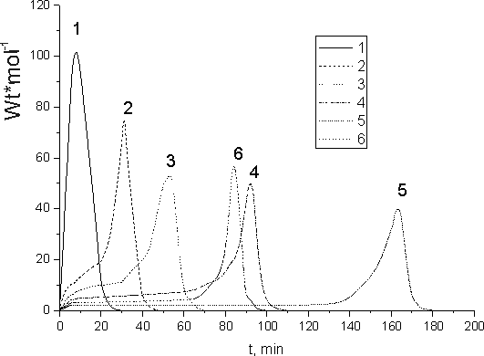 Fig. 11. Dependence of the heat release velocity (polymerization) on the time of irradiation (dose) for: 1 - EA; 2 - EA (95 mole. %) +MMA(5 mole. %); 3 - EA (87.5 mole. %) + MMA (12.5 mole. %); 4 - EA (75 mole. %) + MMA (25 mole. %); 5 - EA (30 mole. %) + MMA (70 mole. %) и 6 - MMA