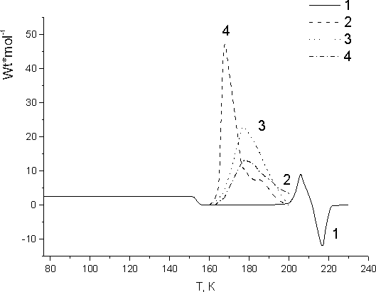 Organic substances frozen at 77 K may exist either in crystal or in glassy state [14]. However, among FA studied after cooling to 77 K only FA-4 was in crystal state, while all remaining FA were glassy. The phase transitions that occur during unfreezing of glassy monomers are exemplified by monomer FA-3 (see Fig.1, curve 1).