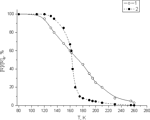 From Fig.4 one may see that the curve related to the damage of PC accumulated in FA-3 (curve 1) differs from that of PC temperature dependence in irradiated FMA-2 (curve 2). The rate of PC damage in FA-3 acryl monomer is less than that in of PC damage in FMA-2 methacrylate monomer. However, as in the case of FMA-2 methacryl monomer, in the course of irradiated FA-3 glassy acryl monomer heating post-polymerization occurs within the temperature range between FA-3 devitrification and crystallization (Fig. 1, curve 2), when effective damage of stabilized PC is observed (Fig. 4, curve 1). Those results evidence that the radicals stabilized during those monomers radiolysis at 77 K perform as their initiators of their low-temperature post-polymerization in supercooled liquid.