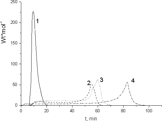 (curve 1) and after irradiation with various doses (curves 2-4). One may see that post-polymerization