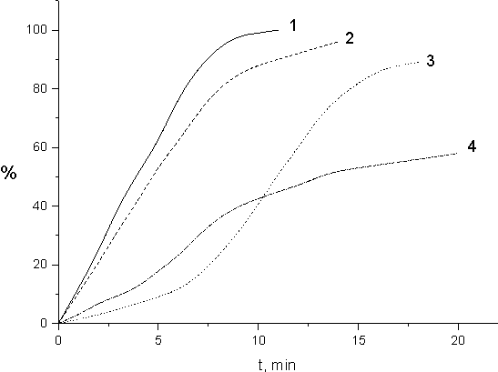 after switching of γ-radiation (Fig.10, curve 5). Gel-effect is observed only when ~40%