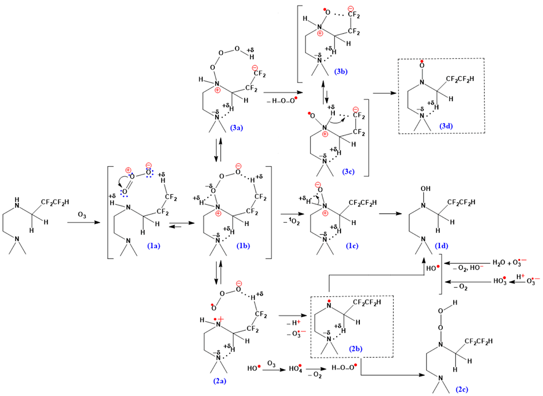 The elimination of singlet oxygen (through the stage of generation of the ion pair (1c) +N–O-) promotes the formation of the final product, hydroxylamines (1d). The formation of >N–OH can proceed through the generation of aminyl radicals >N• (2b), the subsequent interaction of which with alkoxy radicals will lead to nitroxyl esters >N–OR, and with the hydroperoxide radical, the product (2c). The transition (1b) (2a) is characterized by an energy barrier of 10 kcal/mol. Further cleavage of the proton from the radical cation (2a) promotes the formation of an aminyl radical. The stabilization of the (2a) structure is influenced by the non-covalent interactions between the ozonide anion and the proton of the HCF2 group.