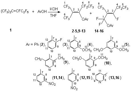 Introduction of fluorine atoms into organic molecules has brought to generation of series of new specific properties that are widely used in creation of up-to-date materials [1,2]. That considerably stimulates intensive development of the chemistry of fluorine-containing organic compounds that was caused by demands of technique and modern medicine. The class of bioactive compounds has been of growing interest after discovery of biological activity growth when fluorine atoms and perfluoroalkyl groups are introduced into bioactive compounds. Fluorine-containing intermediate products has been widely used for creation of both medicines and bioactive substances for agriculture [3,4]. Fluorine-containing diphenyl ethers and phenoxy-containing compounds take an important place among commercially used herbicides. One of approaches to synthesize compounds of this class is based on reactions of nucleophilic replacement of fluorine atoms with O-nucleophilic reagents in internal perfluoroolefins. Thus, it was shown that interaction of dimer and trimer of hexafluoropropylene in the presence of triethylamine [5,6] or sodium phenolate [7] results in formation of products of replacement of fluorine atoms at the double bond. Majority of aromatic compounds containing the OH group under conditions of catalysis with bases is effective O-nucleophilic reagents. The reactions resulting in the products of replacement of fluorine atoms at the internal double bond were described: between paracreosol and dimer or trimer of hexafluoropropylene [8], N-(4-hydroxyphenyl)acetamine and dimer of hexafluoropropylene [9], 3-oxybenzodioxane and trimer of hexafluoropropylene [10], methyl ether of 4-oxybenzoic acid and tetrafluoroethylene pentamer [11] . This work is aimed to the synthesis of partially fluorinated alkenaryl ethers based on perfluoro-2-methyl-2-pentene (1) and various derivatives of phenol with the purpose to determine influence of fluorine atoms on biological activity of this class of compounds and intermediate products. It is essential to produce by a way of direct fluorination completely fluorinated alkylcyclohexyl ethers used as high-temperature heat carriers and dielectrics. It is known that when N-nucleophilic reagents react with internal perfluoroolefins in the presence or absence of bases, the isomerization of the starting perfluoroolefins takes place. In the case of perfluoro-2-methyl-2-pentene there is formed perfluoro-2-methyl-1-pentene as an intermediate product, its terminal double bond contains extremely a nucleophilically labile fluorine atom. This condition can considerably influence the direction of the further attack of the nucleophilic reagent and can result in products of a different structure. Thus, another task is arisen: to study the influence of the nucleophilic reagent used and conditions of the process taken into account the properties of the starting internal perfluoroolefin. Earlier it was shown that the interaction of phenol and compound 1 in the presence of KOH in tetrahydrofurane resulted in formation of [3,3,3-trifluoro-1-pentafluoroethyl-2-trifluoromethyl-oxypropenyl[benzene (2), a product of a formal replacement of the fluorine atom at the double bond.