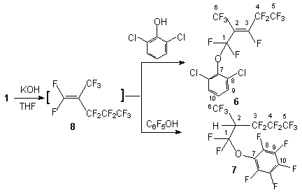 Scheme1 We have determined that the interaction of compound 1 and phenols containing electron donating substituents (2-fluorophenol, 3-metoxyphenol, 3,5-dimetoxyphenol) does not change the character of product formation, there are formed compounds (3-5) respectively. At the same time the reactions of compound 1 with 2,6-dichlorophenol and pentafluorophenol under the same conditions give (1,1,3,4,4,5,5,5-octafluoro-2-trifluoromethyl pent-2-enyloxy)-2,6-dichlorobenzene 6 and (1,1,3,3,4,4,5,5,5-nonafluoro-2-trifluoromethylphenoxy)-pentafluorobenzene 7 respectively. One of explanations of that is the replacement of the fluorine atom in terminal olefin 8 formed from olefin 1 under action of the base.