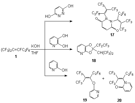 Scheme 2 Such a behavior of these phenols probably is a consequence of the presence of the chlorine and fluorine atoms at the 2- and 6-positions and due to low reactivity of the respective phenolate anions. But the reaction of compound 1 with 2,6-dimethyl-phenol and 2,6-dimethyloxyphenol results in the formation of compounds 9 and 10 despite considerable space requirements. At the same time these results can not be explained by only electron donating properties of the substituents because in the case of interaction of compound 1 with 3-nitrophenol and 4-nitrophenol there are formed mixtures both of the product of fluorine replacement at the internal multiple bond and of the product of fluorine replacement at the terminal bond of intermediate olefin 8 ( compounds 11,12,14,15 respectively). The formation of compounds 14 and 15 is caused by a difference in rates of nucleophilic attack of phenoxy-anion to the carbon atom of the double bond and the rate of isomerization of olefin 1. It is reasonable to expect a similar behavior in the reaction of compound 1 with 3-oxypyridine also, a mixture of compounds 13 and 16 is formed. It was shown that in case of the presence of two OH-groups the reaction involved the two groups with formation of the product of replacement of the fluorine atom at the double bond (compound 17). Thus, interaction of compound 1 and pyridazine-3,6-diol in the presence of KOH in tetrahydrofuran gives 1,5-bis[3,3,3-trifluoro-1-pentafluoroethyl-2-trifluoromethylprepenyl]1,2-dihydropyradizine-3,6-dion 17, whereas the reaction with 2,3-dioxypyridine gives 2-pentafluoroethyl-2(2,2,2-trifluoro-1-trifluoromethyl-ethyl)-[1,3]dioxolo[4,5-b] pyridine 18.