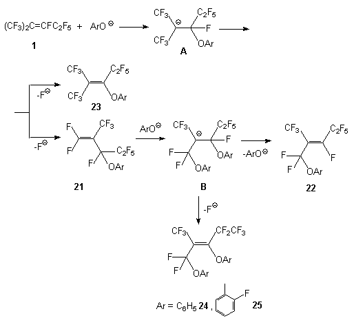 Scheme 3 In the case of reaction of compound 1 with 2-oxypyridine ,as it should be expected, a mixture of 2[3,3,3-trifluoro-1-pentafluoroethyl-2-trifluoromethyl-propenyloxy]pyridine 19 and 1[3,3,3-trifluoro-1-pentafluoroethyl-2-trifluoromethyl-propenyl]1H-pyridine-2-on 20 is formed. That may be explained by the attack of the double bond of olefin1 by O- and N-nucleophilic centers. The reaction of compound 1 with phenol begins by the attack of O-nucleophilic center of the reagent towards the carbon atom of the internal double bond following by generation of intermediate carbanion A stabilized by two CF3 groups. Further transformations of the latter may proceed at the expense of elimination of the fluoride ion both from the CF fragment and from the CF3 group. Comparing thermodynamical stability of the end products, it turned out that the elimination of the fluoride ion from the CF fragment and formation of the product containing phenoxy substituent at the a position to the double bond is more preferable. Prevailing formation of perfluoroolefin 2 in the reaction of compound 1 and sodium phenolate should then be ascribed to kinetic control. However, it must not be ruled out a different way to form compounds 14-16 which may consist in the formation of compound 21 from intermediate carbanion A. In fact, authors [5] have determined the formation of olefin 21 in the reaction between compound 1 and phenol and have isolated such an olefin. The fluorine atoms at the terminal double bond in olefin 21 are more sensitive to the action of nucleophilic reagents comparing with fluorine mobility at the internal double bond of olefin 1. The interaction of olefin 21 with phenolate anion gives intermediate carbanion B. In it stabilization of negative carbanion under action of phenoxy group (OAr) is less effective and there are two ways of stabilization of this carbanion: elimination of the fluoride ion from the CF fragment that brings to reaction products 24 and 25 or elimination of the phenoxy-anion leading to the formation of compound 22. This way is observed exclusively for ArO=OC6F5,OC6H3Cl22 - 2,6; for other phenols containing, for example, NO2 group in the benzene ring a mixture of compounds of 22 and 23 type is formed.