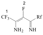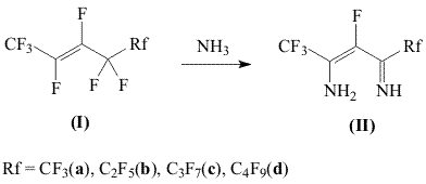 A.N.Nesmeyanov Institute of Organoelement Compounds RAS, Aliphatic polyfluorinated β-diimines (II), firstly described in 1980 [1], appeared to be a class of compounds with prospects. Polyfluorinated β-diketones (heptafluoroacetylacetone and its homologes) [2], different heterocyclic compounds - pyridines and pyrimidines, supporting fluoroalkyl substituents [3,4,5] were obtained based on them. Besides that, polyfluorinated β-diimines (II), being bis-azaanalogues of β-diketones are ligands of a new type. The present article is devoted to the development of a new laboratory obtaining method for polyfluorinated β-diimines (II). All of the β-diimines (II) synthesis methods offered before and the one discussed in this article are based on the interaction of linear perfluoroalknenes-2 (I) and ammonia: In the first of the described methods [1] the reaction of alkenes (I) and ammonia was carried out in autoclave. Natural limitations, which are caused by the size of autoclave, are the are the drawbacks of the present method. The synthesis method (II) using the interaction (I) with aqueous ammonia which was offered later [2] doesn't lack in drawbacks as well. Olefines (I) do not mix with aqueous ammonia and higher volumes of solvents, which are inevitably lost at processing the reaction mass with water, are needed to carry out the reaction. Method offered here is based on the interaction of alkenes (I) and aqueous ammonia in the medium of ether at temperatures of -40oC : -30oC. The present method has got significant advantages compare to the ones described before [1,2]: the reaction is carried out at atmospheric pressure, it is easily enlarged to the multilitre reactors, the solvent used is returned into the cycle with minimum losses. Experimental Part NMR 1H and 19F spectra are recorded using the "Bruker AV-300" (300 and 282,38 MHz) spectrometer, chemical shifts are listed in ppm scale is relative to CF3COOH and TMS , spin-spin coupling in Hz. 1200 ml of diethyl ether were put into the glass reactor equipped with drop funnel, reflux condenser cooled by the mixture of dry ice-acetone, and thermometer. Ether were cooled to -42oC and 200 ml of liquid ammonia were poured into the reactor. Then at constant mixing (magnetic mixer) 117.1 g (0.47 mole) of perfluoropentene-2 (Ia) were added to the mixture obtained. The reaction mass was being mixed for 30 minutes, then the cooling was off and the solution was let to warm up at room temperature. The reaction mixture of orange color with white residue was poured into water, the ether layer was separated , washed with water (3X1000 ml), dried over CaCl2. Ether was distilled, 75.8 g (72%) 2-amino-4-iminoperfluoropentene-2 (II a) were obtained by the distillation. Other β-diimines (II b-d) were synthesized by analogy; spectral data and physical constants of obtained compounds are listed Table 1. Table 1. Spectral Characteristics and Physical Constants of Obtained Compounds