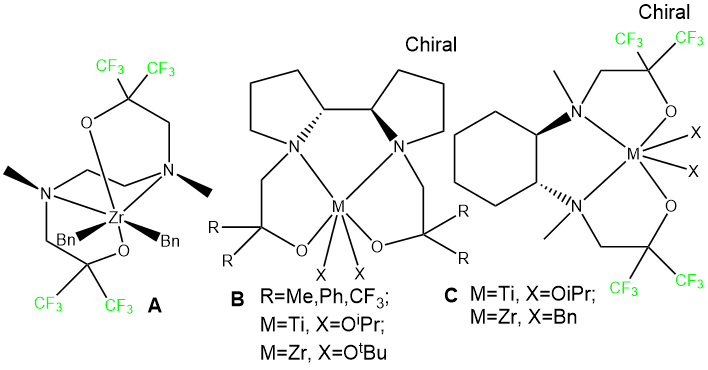 At present, there is a noticeable increase in interest to a new generation of olefin polymerization catalysts based on transition metals coordination compounds (non-metallocene catalysis [1-7]). Among them, Group 4 non-metallocene catalysts with [NO] and [ONNO]-type phenolic ligands, such as phenoxyimines [8], bis(iminopyrroles) [9], as well as complexes with salan [10], salophane [11] and aminophenol ligands [12] were investigated to the full possible extent. At the same time, the complexes of these metals stabilized by ligands with amino-groups and alcoholic hydroxy groups are much less studied. A few examples of such structures are shown in Figure 1.
