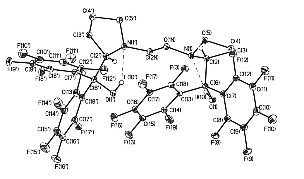 Both hydroxy groups in the molecule 4 participate in the intramolecular H-bonds with the formation of a 5-membered hydrogen bonded cycle The geometric parameters of the H-bonds are somewhat different. In particular, the distance between the donor and proton acceptor N(1)...O(1) and N(1')... O(1') is 2.721 (1) and 2.650 (1) Å, respectively. The observed differences in the strength of H-bonds apparently lead to the above variation of the geometric parameters of the pyrrolidine rings. The shortening of the H-bond O(1')-H(1O')...N (1') is apparently due to intramolecular factors, since the perfluorinated cycles actually completely shield the H-bonded cycle. The most probable reasons may be the presence of a shortened O(1')... C(15) contact (3.165(1) Å) that is characterized by the specific orientation of interacting atoms ((O(1')C(15)C(14) 89.5(1)) and thus can be interpreted as O... .. interaction.