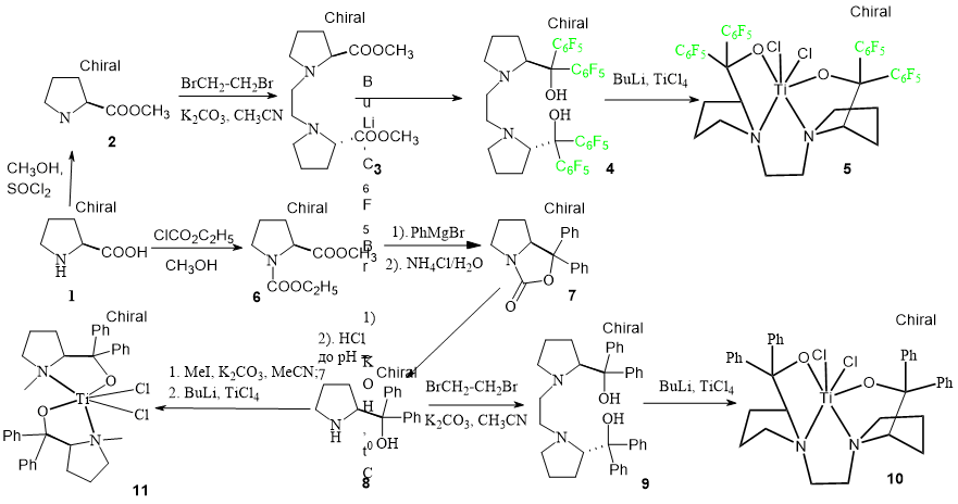Tetradentate ligand 9 has been synthesized by alkylating of diphenylprolinol 8 (prepared according to a known method [19],) with dibromoethane [20] (Scheme 1). Its structure has been confirmed by NMR, IR, mass spectroscopy.