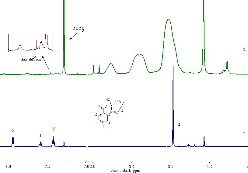 Fig. 1. 1H NMR spectra of CPDB (1) and PPFS, prepared by RAFT polymerization (2), in CDCl3.