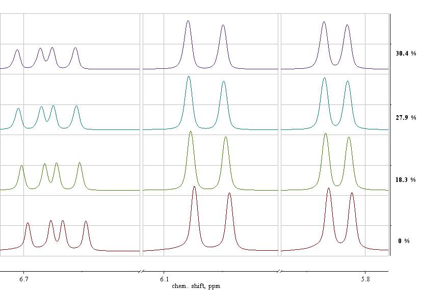 In the 1H NMR spectrum of PFS in DMF-d7 at q = 0% (Fig. 2, a) there are signals with chemical shifts of 6.90 - 5.75 ppm, related to the three protons of the vinyl group (CH=, CH2=) PFS. The integrated intensity of the signals is proportional to the concentration of PFS in the monomer-polymer mixture. To calculate the amount of unreacted PFS and q, we can use the integrated intensities of each of the signals CH2= and CH=, however, to increase the accuracy, we used their sum.