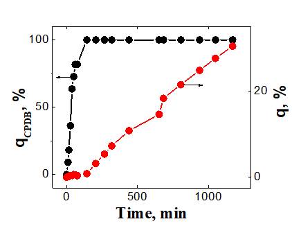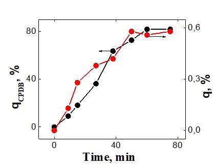 The dependences of q and qCPDB on the reaction time are shown in Fig. 3 (a, b). From Fig. 3b, it can be seen that at the beginning of the reaction (in the time interval from 0 to ~ 80 min), the consumption rates of the monomer and the CPDB practically coincide, which supports the earlier assumption that the signals at 7.98 and 7.93 ppm characterize the adduct of the CPDB and the PFS.