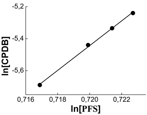 Fig. 4. The logarithmic dependence of [CPDB] on [PFS] during polymerization in DMF-d7 at 50 °С. [PFS] = 2 mol / l, [AIBN] = 2.7 × 10-3 mol / l, [CPDB] = 5.3 × 10-3 mol / l