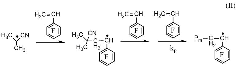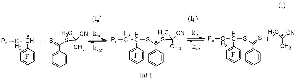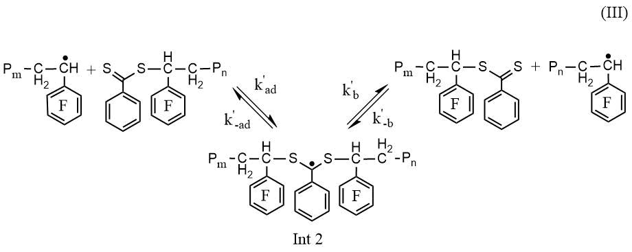 RAFT polymerization of PFS along with the elementary reactions of classical radical polymerization (initiation, propagation and chain termination) includes stages that provide controlled synthesis of poly-2,3,4,5,6-pentafluorostyrene (PPFS): 1) attachment of a growing polymer radical to a low molecular weight CTA with subsequent fragmentation of the intermediate (Int 1), leading to the formation of a macro-CTA and the release of the radical of the leaving group of CTA (Scheme 1, reaction I); 2) reinitiation of the polymer chain by the radical of the leaving group of CTA (Scheme 1, reaction II) and 3) attachment of the growing polymer radical to macro-CTA (Scheme 1, reaction III).
