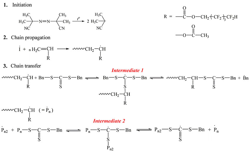 Scheme 1. Scheme for copolymerization of octafluoropentylacrylate and vinyl acetate in the presence of dibenzyltrithiocarbonate as an agent of reversible chain transfer and AIBN as an initiator.