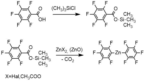 A solution of the zinc-organic compound was prepared from pentafluobenzoic acid in two steps without isolation of an intermediate product from the trimethylsilyl ester of the acid. Pentafluorobenzoic acid was refluxed with an excess of trimethylchlorosilane, and the resulting trimethylsilyl ether was then converted to the corresponding zinc derivative without isolation by reaction with zinc salts or zinc oxide dehydrated previously by azeotropic distillation of water.